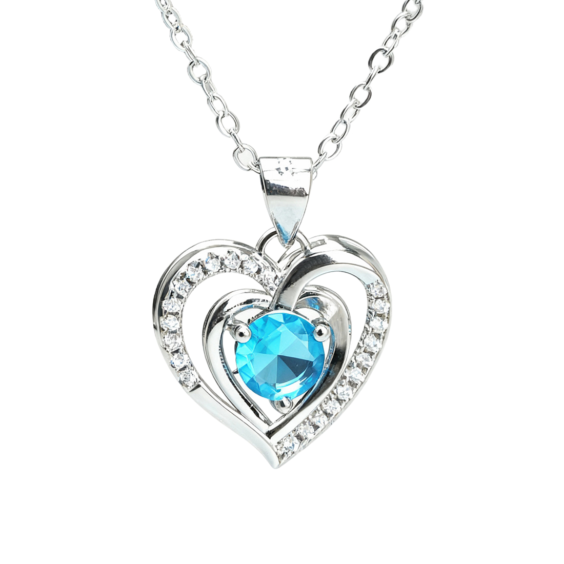 The double heart pendant features a sparkling zirconia stone, available in a selection of meaningful birthstones—from December turquoise for success to February amethyst for peace and April diamond for eternal love. Each gem carries unique symbolism, making it personally significant.