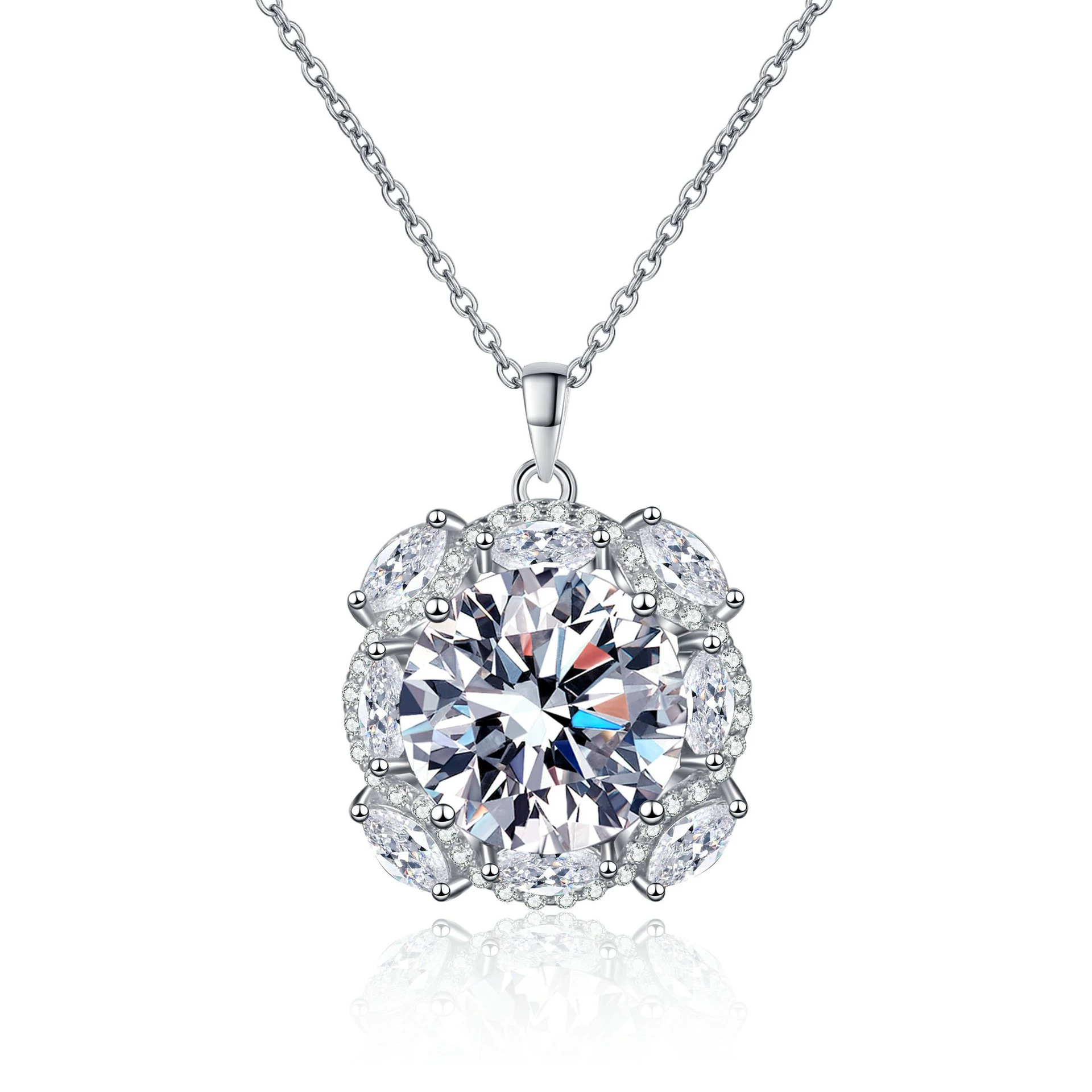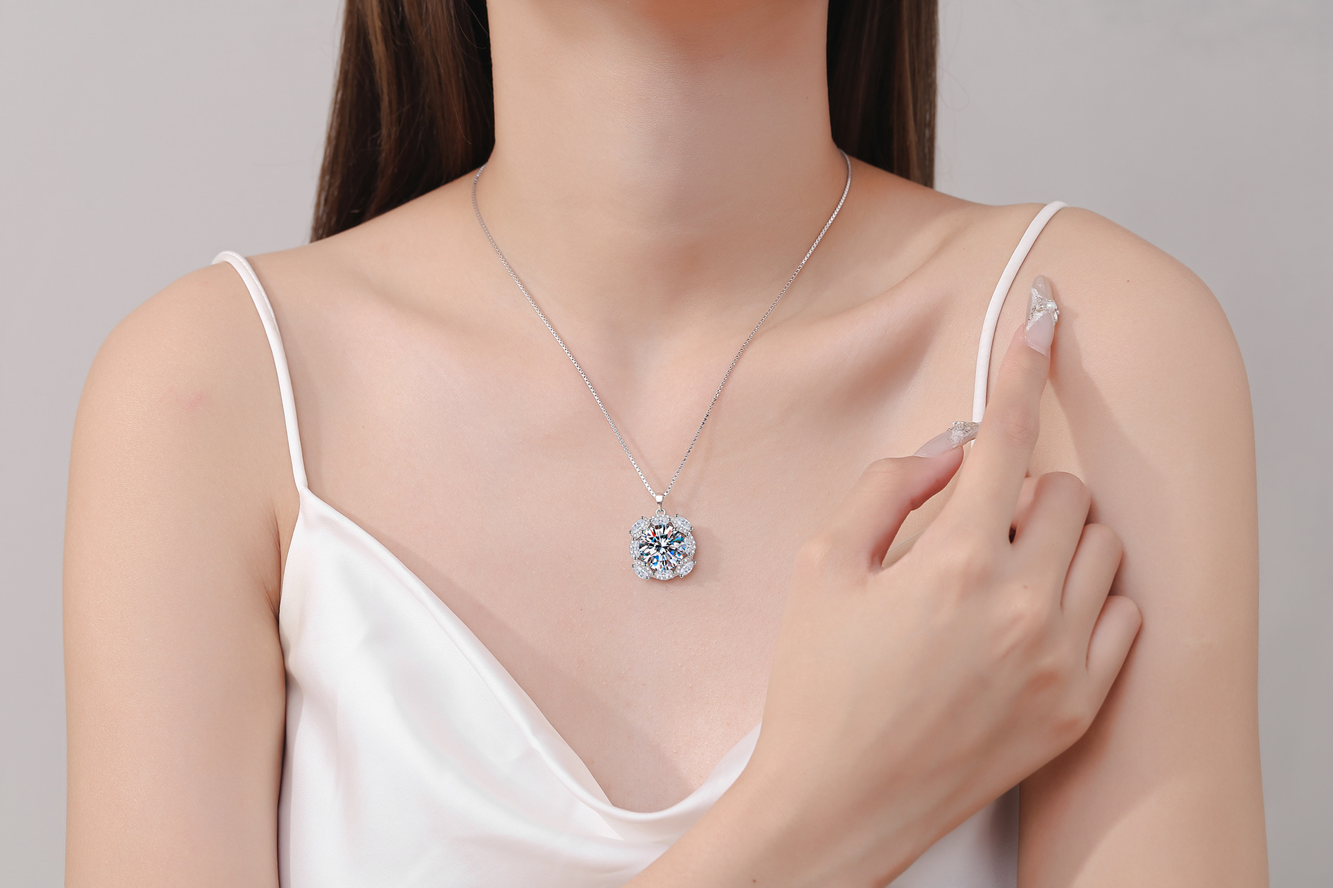 A three-dimensional flower-shaped pendant is made of 925 silver, with a large carat simulated